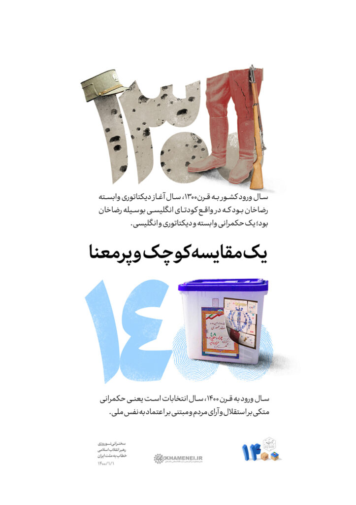 حضرت آیت‌الله خامنه‌ای: «سال ورود کشور به قرن۱۳۰۰،‌ سال آغاز دیکتاتوری وابسته رضاخان بود که در واقع یک کودتای انگلیسی بود؛ یک حکمرانی وابسته و دیکتاتوری و انگلیسی. سال ورود به قرن۱۴۰۰، سال انتخابات است یعنی حکمرانی متکی بر استقلال و آرای مردم و اعتماد‌به‌نفس‌ملی.» ۱۴۰۰/۰۱/۰۱